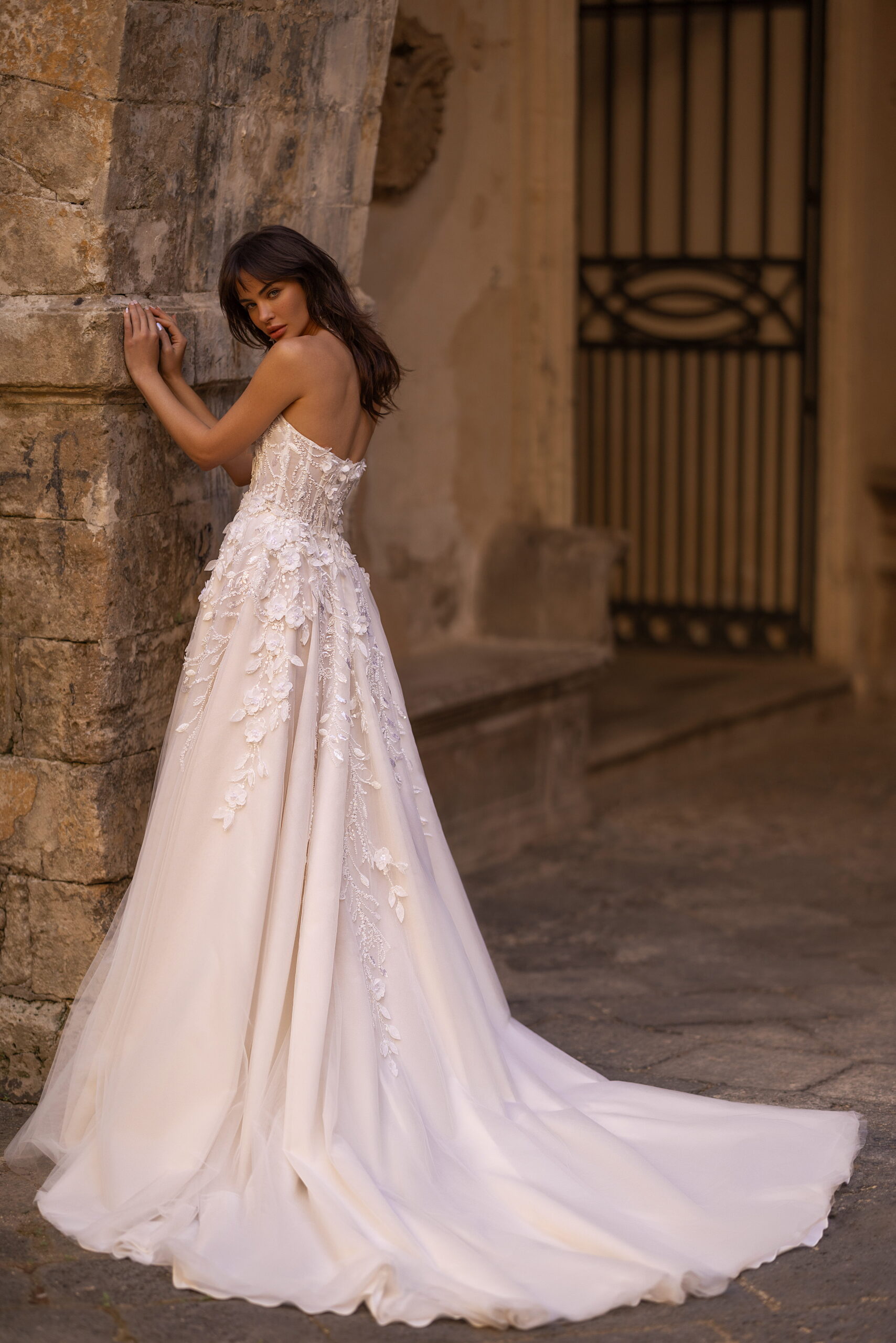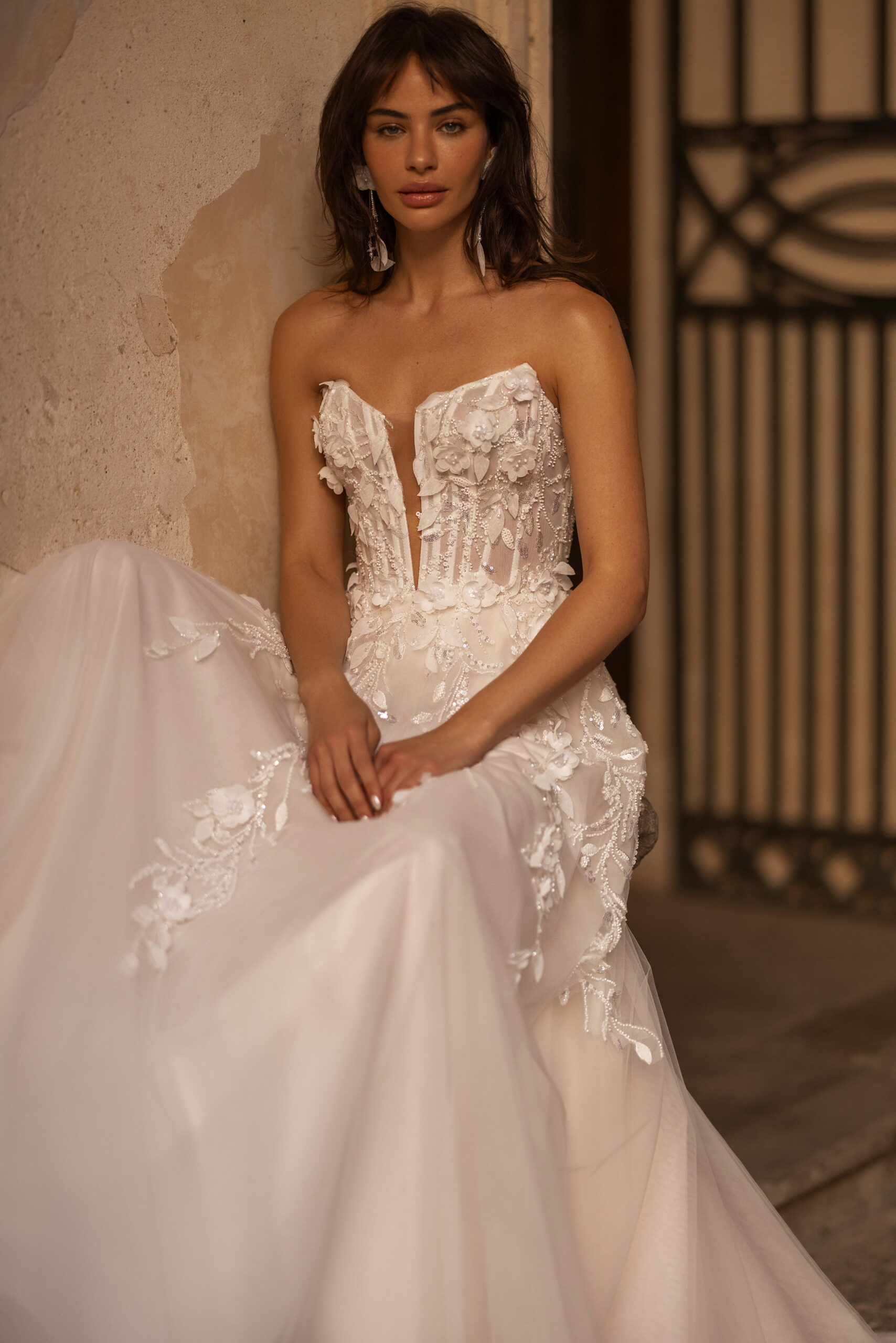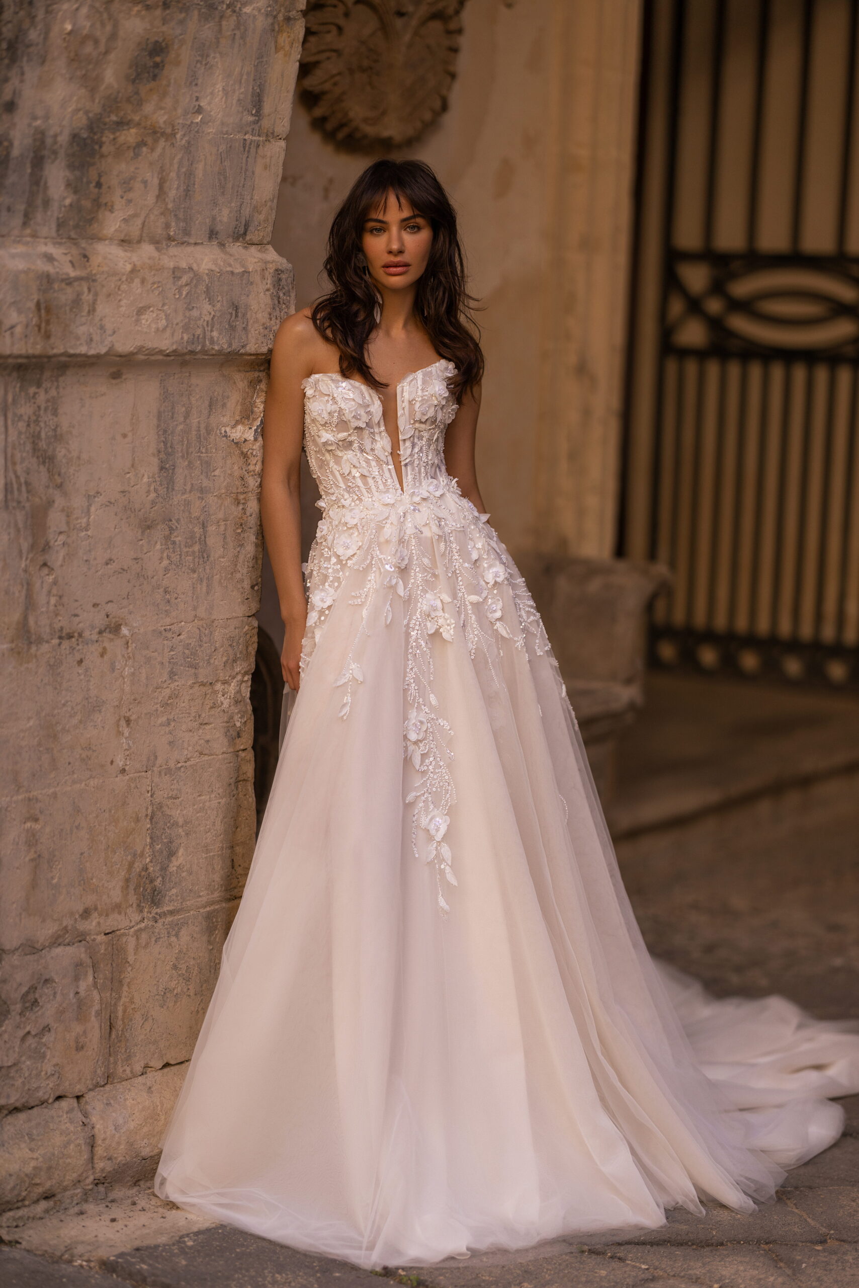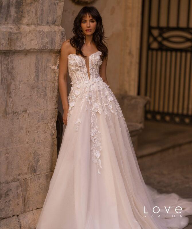 Izgalmas A-vonalú esküvői ruha, derékvonal- és a dekoltázs hangsúllyal. Félig átlátszó felső része csónaknyakkal és elöl, középen, a derékig érő illúziótüllel készült. A hát enyhén ívelt a lapockák alatt. A felső rész finom fényű, 3D hatású csipkével és hímzéssel díszített. A fűzőt rejtett cipzár rögzíti hátul. A lágy, könnyed szoknya királyi uszállyal rendelkezik, ez tüllből készült és 3D csipkével, valamint virágos applikációkkal díszített. A második réteg finom fényű anyagok játéka. A szoknyát hátul középen, rejtett cipzárral zárják. ALAKÍTSD KEDVEDRE! >> Szeretnéd még különlegesebbé tenni ezt a csodaruhát? Kérd lecsatolható vállpántokkal, amelyek fokozzák a romantikus, nőies hatást!