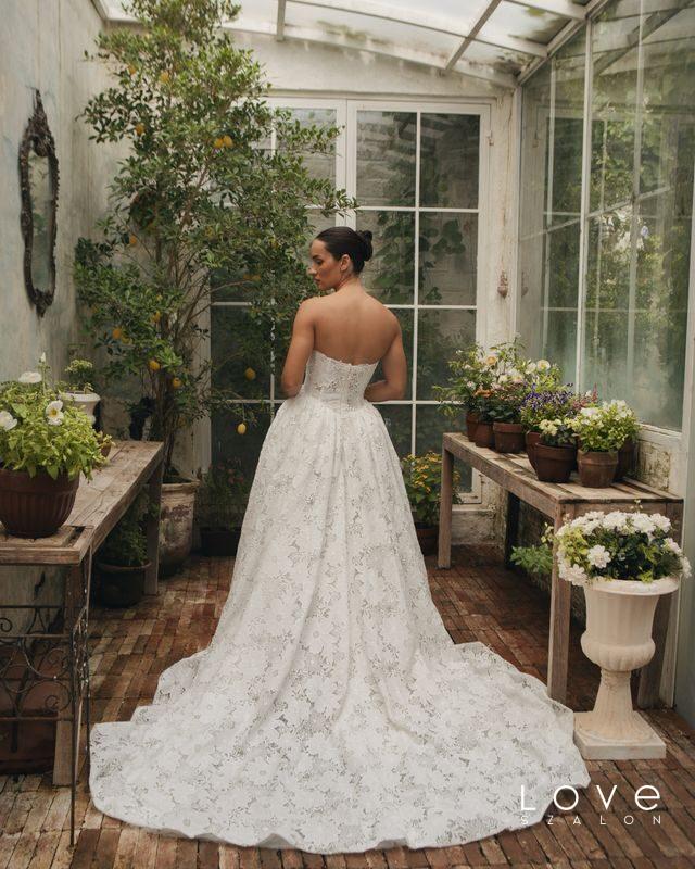 Ez a különleges menyasszonyi ruha látványos, 3D virágmintás csipkéjével és fűzős, szív alakú felsőrészével egyszerre romantikus és modern megjelenést nyújt. A puha, mégis tökéletes tartást adó anyag gyönyörűen követi a felsőtest vonalát, kiemelve a nőies sziluettet. A deréknál finoman V-be mélyülő Baszk stílus elegánsan karcsúsít, és harmonikusan vezeti át a tekintetet a gazdagon redőzött, látványos szoknya felé. Ez a jellegzetes fazon különleges struktúrát ad a ruhának, miközben méltóságteljes és királynői megjelenést teremt. A ruha tökéletes választás annak a Menyasszonynak, aki valami igazán egyedit és elbűvölőt szeretne viselni a Nagy Napon — olyan darabot, amely minden részletében kifinomult és felejthetetlen.