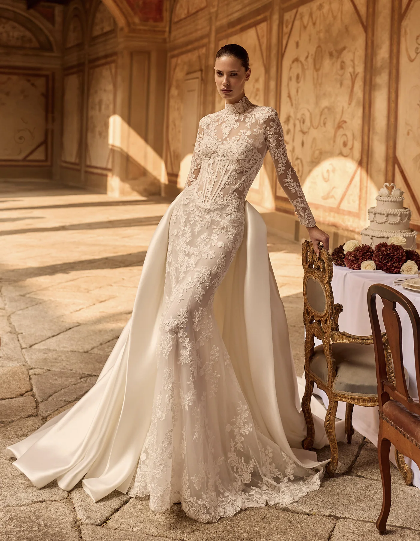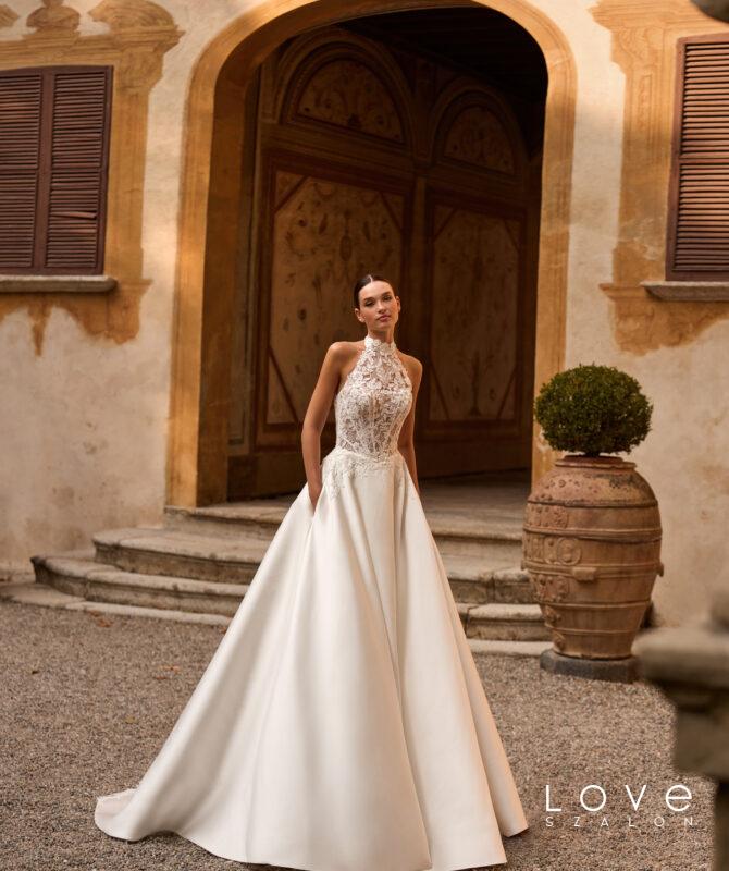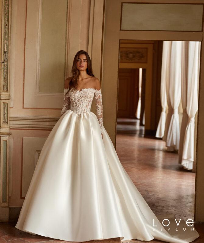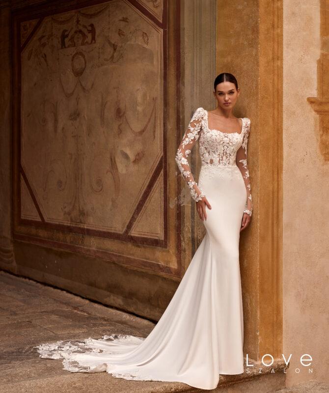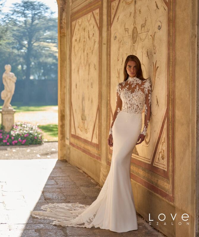 Ikonikus, modern sellő fazonú menyasszonyi ruha a Couture kollekcióból, amely finom csipkéből készült, és elegánsan követi a test vonalát. A strukturált, szív alakú fűzős felsőrész gyönyörűen kiemeli a dekoltázst, míg a karcsú sellő sziluett nőies és látványos megjelenést biztosít. A ruha különlegessége a levehető szatén felsőszoknya, amely egy pillanat alatt drámai, királynői hatást kölcsönöz a menyasszonyi megjelenésnek. A modellhez tartozó csipkekabát pedig még elegánsabbá és sokoldalúbbá teszi a ruhát, így akár két különböző stílusban is viselhető a nagy napon. Ez a menyasszonyi ruha tökéletes választás azoknak, akik a modern eleganciát és a látványos couture megoldásokat szeretnék megélni esküvőjükön.