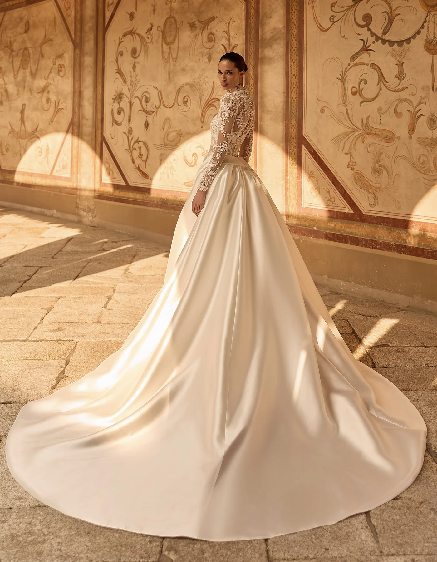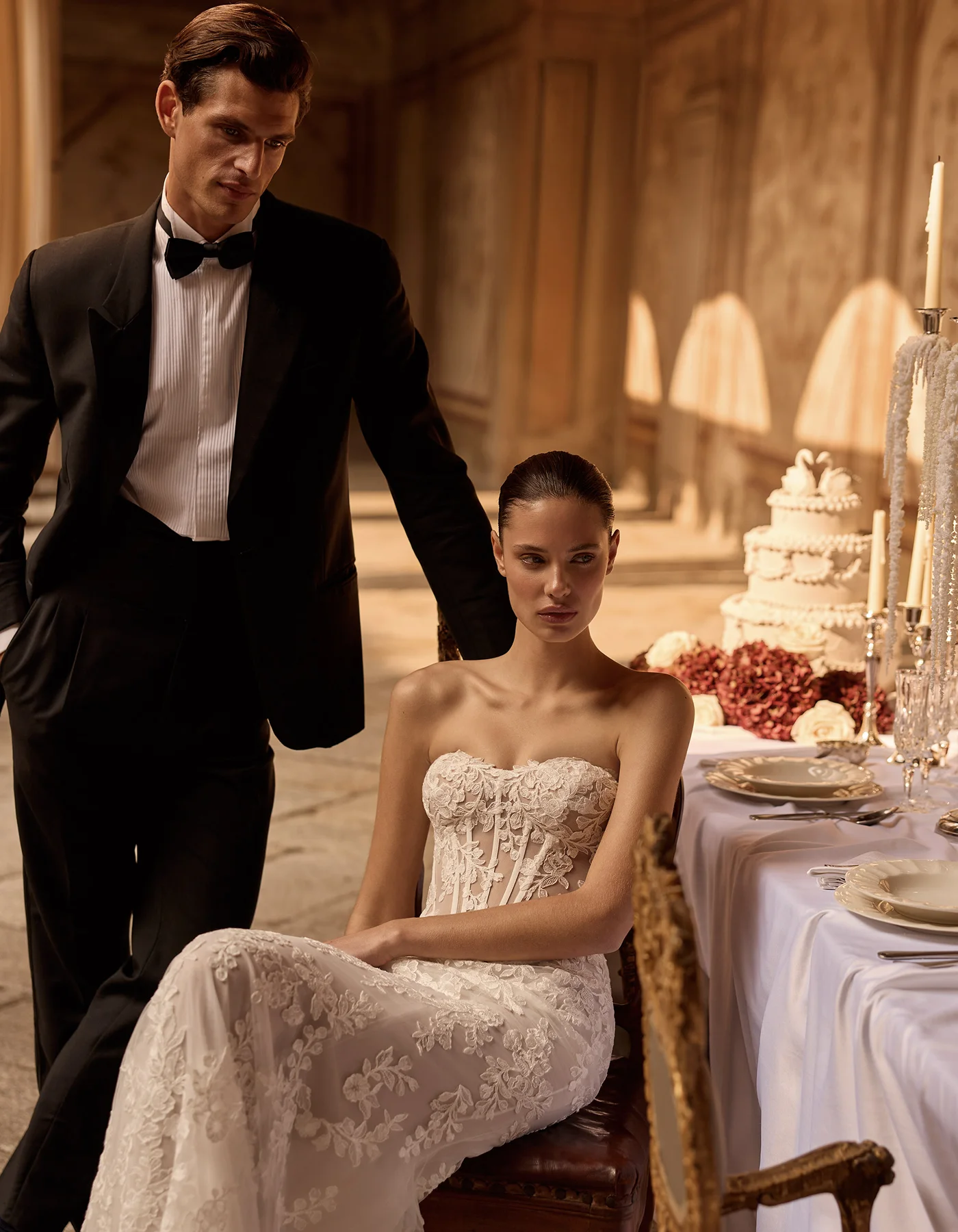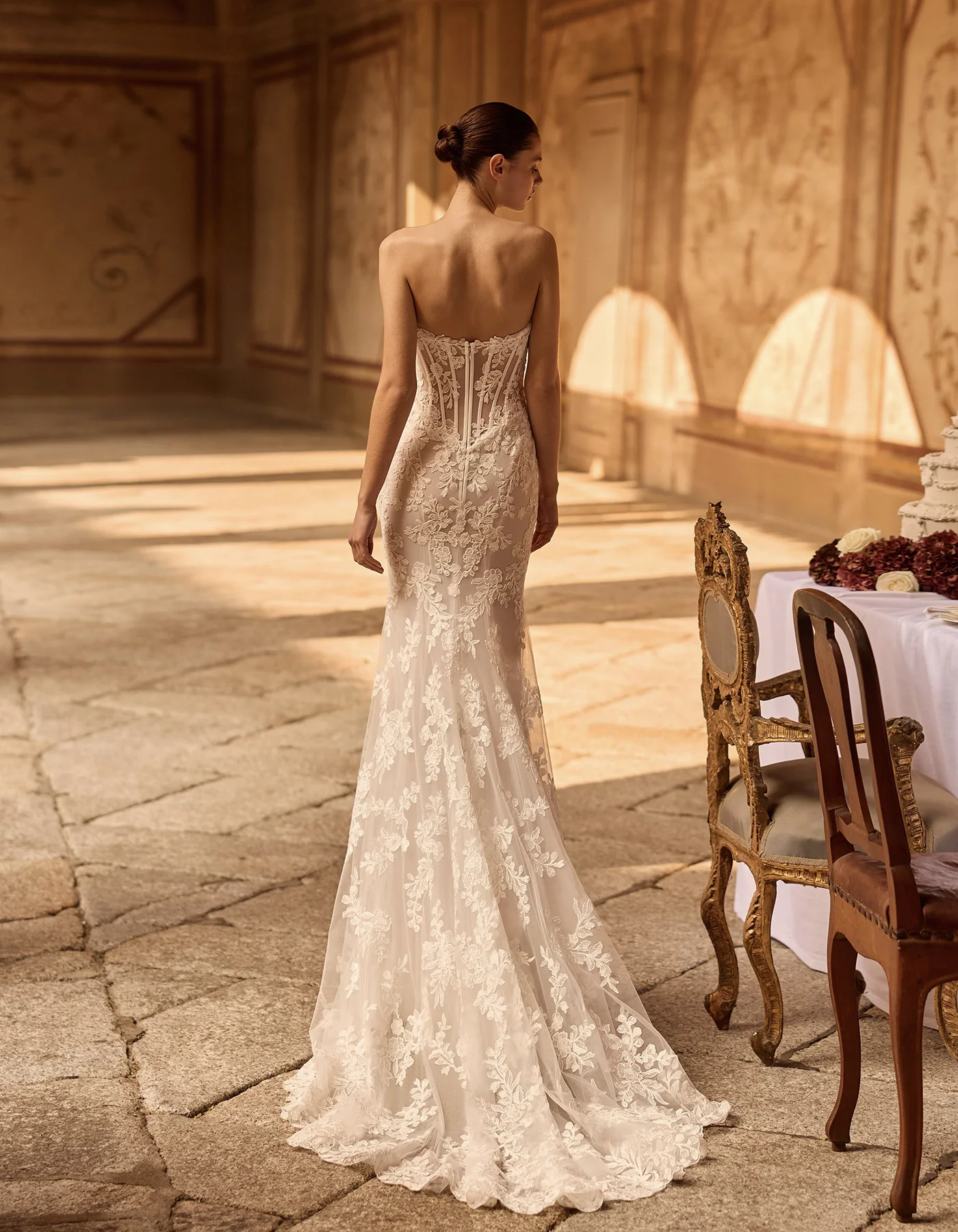 Ikonikus, modern sellő fazonú menyasszonyi ruha a Couture kollekcióból, amely finom csipkéből készült, és elegánsan követi a test vonalát. A strukturált, szív alakú fűzős felsőrész gyönyörűen kiemeli a dekoltázst, míg a karcsú sellő sziluett nőies és látványos megjelenést biztosít. A ruha különlegessége a levehető szatén felsőszoknya, amely egy pillanat alatt drámai, királynői hatást kölcsönöz a menyasszonyi megjelenésnek. A modellhez tartozó csipkekabát pedig még elegánsabbá és sokoldalúbbá teszi a ruhát, így akár két különböző stílusban is viselhető a nagy napon. Ez a menyasszonyi ruha tökéletes választás azoknak, akik a modern eleganciát és a látványos couture megoldásokat szeretnék megélni esküvőjükön.